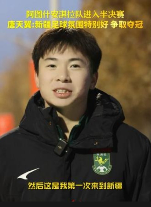 唐天翼说道:“大家好,我叫唐天翼,我来自广东,这是我第一次来到新疆,我代表阿图什安淇拉俱乐部参加这一次喀什杯,我希望我们球队能拿到冠军。来到新疆,我感觉新疆的足球氛围特别好,我挺喜欢这里的氛围的,我也希望就是新疆足球和中国足球都越来越好。”