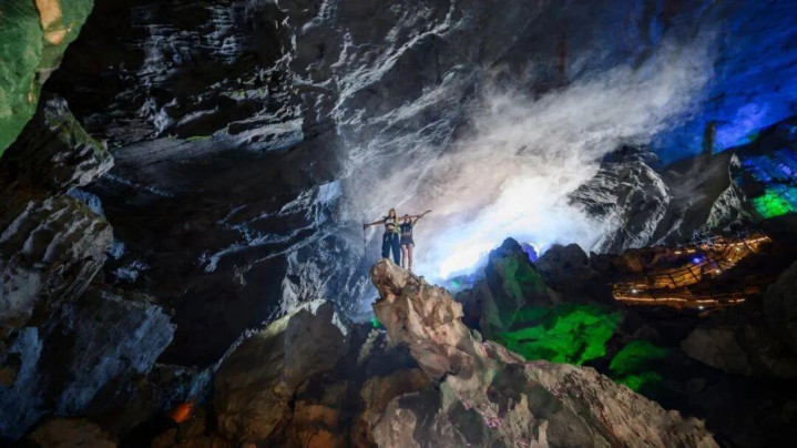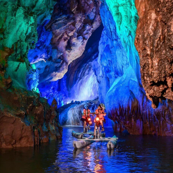 船游地下河/漂浮飞艇:贴岩穿行,打卡冰沁蓝河道、国内最大溶洞瀑布群。
